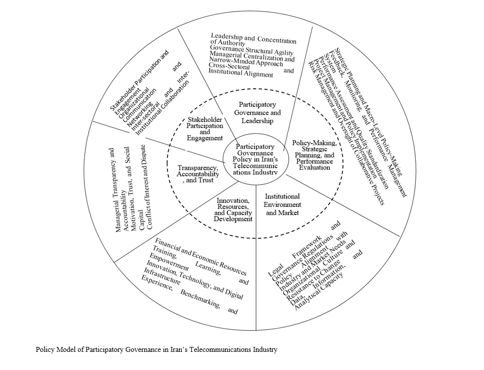 This study aimed to develop a policy framework for participatory governance in Iran's telecommunications industry. The research was qualitative in nature, employing a case-study approach within the Iranian telecom sector. Participants included managers and experts from telecommunications companies, related firms, as well as academics specializing in public administration and policy-making. Using purposive sampling with a snowball approach, 14 participants were selected until theoretical saturation was reached. Data were collected through semi-structured interviews and analyzed using thematic analysis (including initial coding, sub-themes, and main themes). The credibility and reliability of the data were confirmed through various validation techniques. Analysis of the interviews initially yielded 350 codes during open coding, which, after merging duplicates, were reduced to 213 primary codes. These were ultimately organized into 23 sub-themes and six main themes. The findings indicate that implementing participatory governance in Iran's telecommunications industry requires simultaneous reforms across six key areas: participatory leadership and governance, strategic policy-making and planning, active stakeholder engagement and collaboration, managerial transparency and accountability, development of innovation and technological capacity, and alignment with institutional and market environments. Therefore, establishing participatory mechanisms, enhancing interdepartmental coordination, expanding technological and human resource capacities, and aligning policies with market needs are essential for improving the effectiveness of participatory governance policies in this sector.